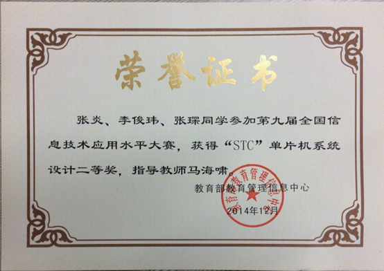 ylzz总站线路检测学生在第九届全国信息技术应用水平大赛中获得全国二等奖