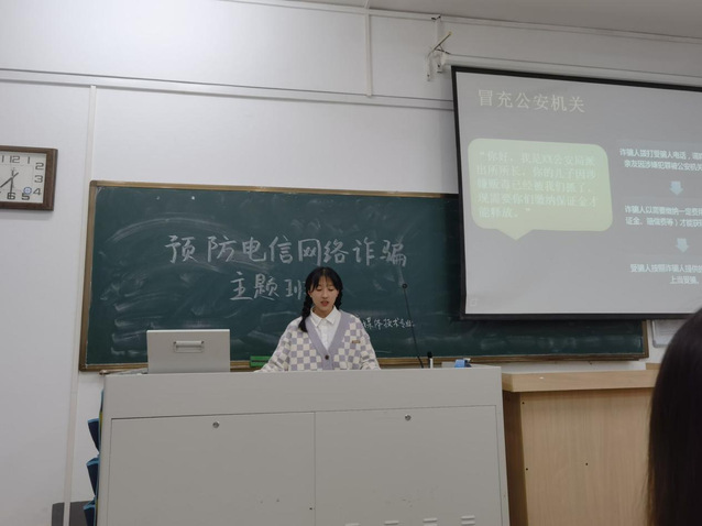 班会伊始,主持人介绍了常见电信诈骗形式和案例,如QQ诈骗、冒充身份诈骗、网络购物诈骗、虚假中奖诈骗等。随后,主讲人着重介绍了冒充身份诈骗的实施过程。近年来,冒充司法人员,执法人员,通讯部门人员,甚至熟人或领导来进行诈骗的案件层出不穷,此类案件手段低劣却常有中招。主持人强调,面对此种情况,不主动透露个人信息或主动猜测对方身份,而应该选择挂断电话后到当地的公安局或司法机关进行咨询。