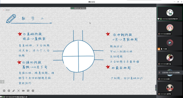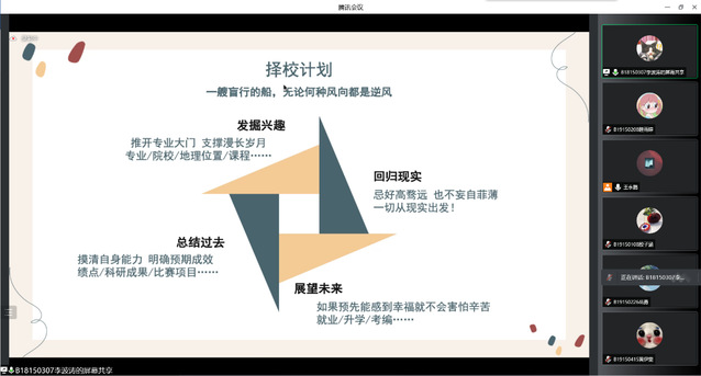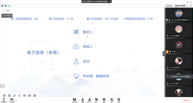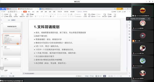 这次考研分享会的各位主讲人以自身经验为例从考研动机、学习方法、择校经验、资料准备、考研时间安排、计划制定等方面为切入点,向同学们分享了考研经验,强调备战考研要加强专业知识、夯实数学基础、提高政治敏感度和丰富英语阅读能力。同时,主讲人们还强调了心态调整对于考研的重要性,“心态一定程度决定了考研成败,坚持方得始终”“合理作息,定期锻炼”“身体是革命的本钱”等。首先,金怡同学重点分享了教育技术学专业文科背诵的经验和计划,她谈到每天至少需要抽出半天的时间来背诵基础知识点,半天的背诵时间分成早、中、晚,不断复盘,加深记忆;李波涛同学则是在择校计划和备考心态的调节等方面阐述其经验与心得,在选择备考院校时可以结合个人的兴趣、能力、地理位置等方面综合考究,同时要尽早确定自己的努力方向,才能使自己在备考学习旅途中不会感到迷茫;第三位主讲人李洲同学提出了关于备考数学的切身感受与经验,他讲到要始终对数学保持热情,将数学分为三个复习阶段,不同的复习阶段有不同的学习方法和目标、任务,重视解题思路、技巧和错题的复盘,不能好高骛远;最后一位主讲人梁觉文同学着重谈述了计算机专业备考时的所考科目,同时详细讲解了各科目在不同阶段下的复习方法与技巧并推荐了复习书籍和网课资料。