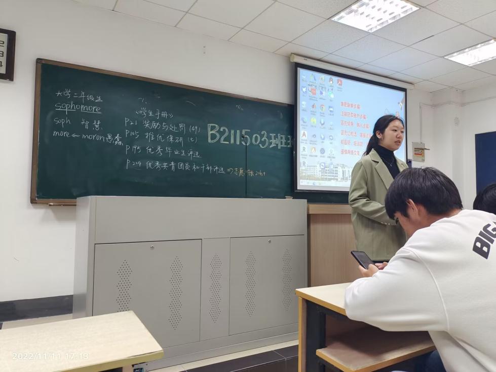为了进一步提高同学们对防疫工作的重视,适应线上线下转换教学方式,加快学习进度、提升学习效率,2022年11月11日下午,ylzz总站线路检测B211503班在教2-118召开了“坚持配合防疫,从容迎接期末”的主题班会。本次班会由辅导员吴美萱老师、班主任邢岩老师主持,B211503班全体学生参加。