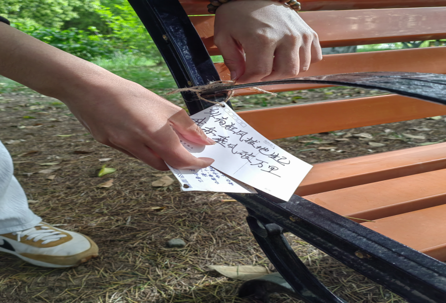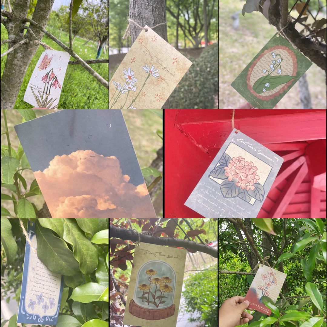 本次心理班会提前收集了写满同学们祝愿的明信片,将其藏匿于校园各角落。在寻找的过程中,同学们仔细感受蓝天白云,鸟语花香,一草一木观察自然之景、聆听自然之声,是一种有效的放松方式,也是与自己沟通的途径之一,帮助大家释放心中的压力与负担。