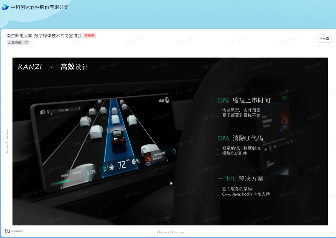宣讲环节中,企业技术老师们系统解析了数字媒体岗位的三维引擎开发、交互设计、车载HMI设计等核心技能要求,并通过ppt以及视频演示Kanzi项目案例。他们强调特别看重学生的技术转化能力,曾在学院科创竞赛中获奖的同学将优先进入人才库。