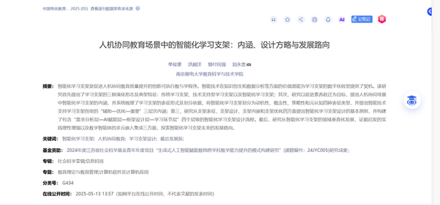 近日,ylzz总站线路检测教师单俊豪在教育学CSSCI来源期刊《中国电化教育》上发表题为《人机协同教育场景中的智能化学习支架:内涵、设计方略与发展路向》的论文。ylzz总站线路检测刘永贵副教授为论文通讯作者,本科生洪越洋为论文第二作者、本科生郭付民强为论文第三作者。