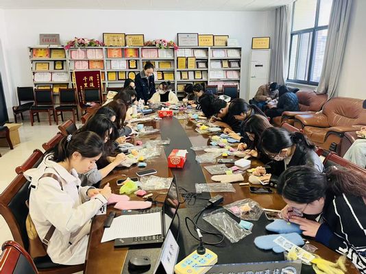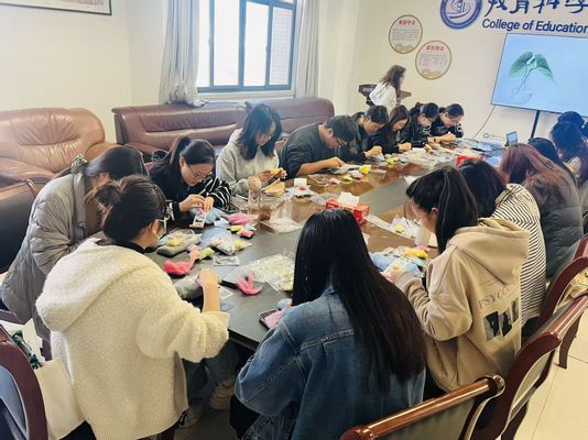 活动伊始,工作人员向大家详细介绍了羊毛毡手套的保暖特性、制作技巧及心理疗愈价值,随后发放了色彩丰富的羊毛、戳针、手套基底等材料工具。大家迅速投入状态,先根据喜好挑选羊毛颜色,在基底上勾勒初步图案,再手持戳针反复戳制。从蓬松羊毛到紧实图案,从简单配色到创意装饰,现场满是戳针与布料接触的“哒哒”声,夹杂着技巧交流的欢声笑语。